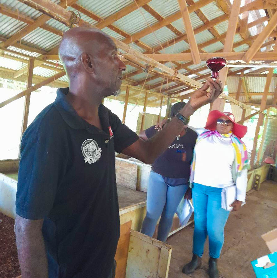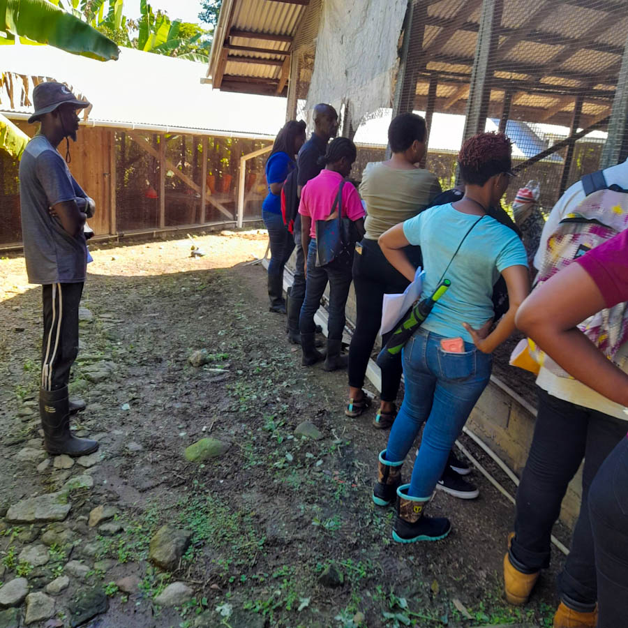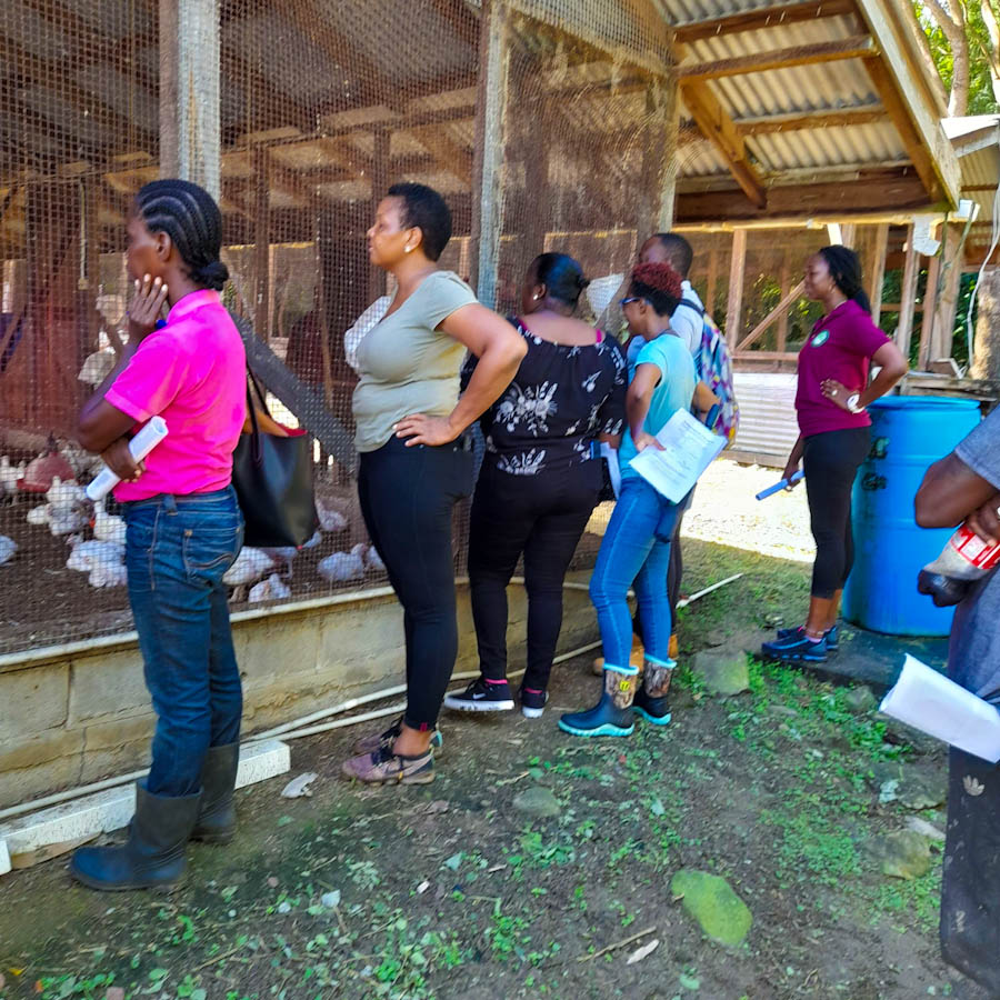 Practical training sessions were conducted at the TAMCC Mirabeau Campus (Farm School) in St. Andrew and at Oasis Poultry farm, Mt. Craven in St. Patrick focused on topics such as Determining the animals’ body weight by use of weight tape; use of the FAMACHA card to check eyes and if and how to properly deworm animals; Determining animals’ age by checking its teeth’s; Body Condition scoring; Hoof trimming and Brooding management and Post hatch feeding in Day Old chickens.